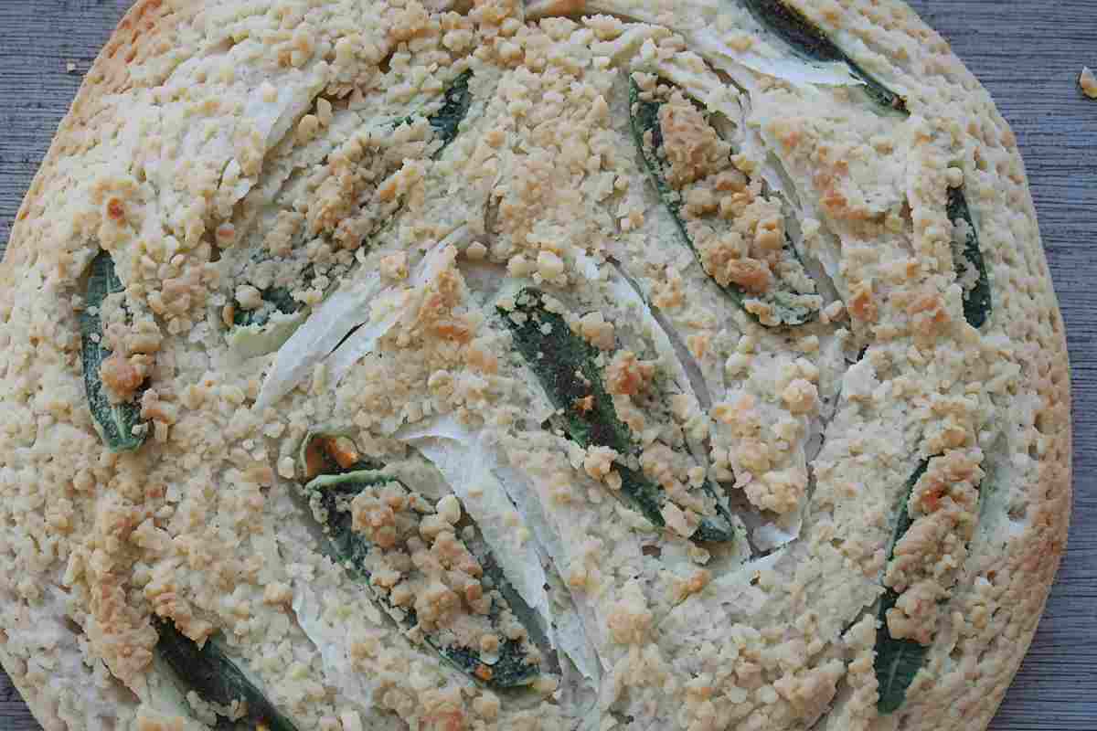 - A questo punto, stendere l’impasto nella teglia, formare le classiche “fossette” con le dita, distribuire metà del burro nocciola, premere le foglie di salvia nell’impasto, e se si vuole aggiungere sale in fiocchi;
